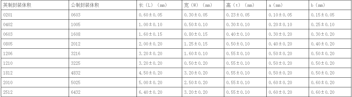 眾所周知貼片電感外形體積常見有九種封裝尺寸如0201、0402、0603、0805、1206、1210、1812、2010、2512等,不同的封裝尺寸它的額定功率也是不同的。而貼片電感型號大小一般用四位整數所表示,舉例:0805這型號電感,前兩位則表示電感長度,后兩位則表示電感寬度,不過根據長度單位的不同有兩種表示方法,一種為英制表示,另外一種則為公制表示。打比方英制表示法按0805這型號電感解析,英制長度為0.08英寸,而寬度為0.05英寸;公制表示法2012型號電感解析,公制長度為2.0;公制寬度為1.2(表示單位:mm)。一般行業的慣用叫法都是以英制為主。下面小編會列出常見九種封裝尺寸公制英制表格供大家參考學習。