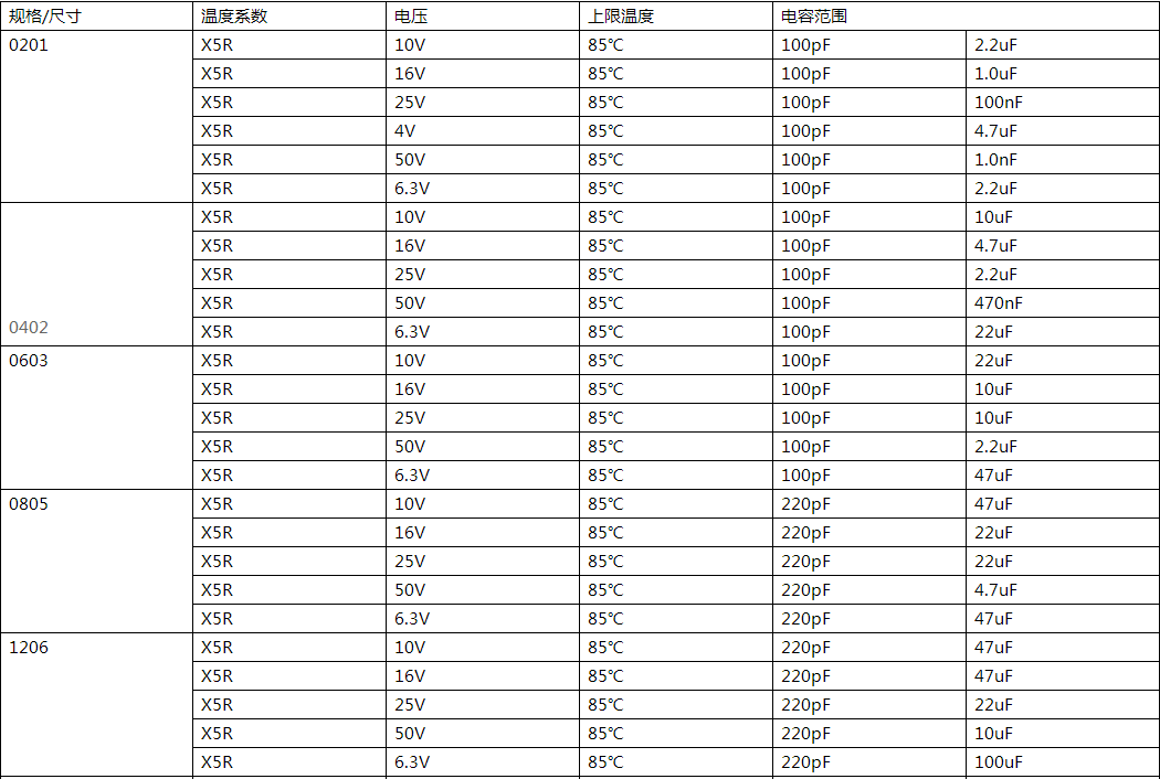 國巨X5R電容器常用參數表